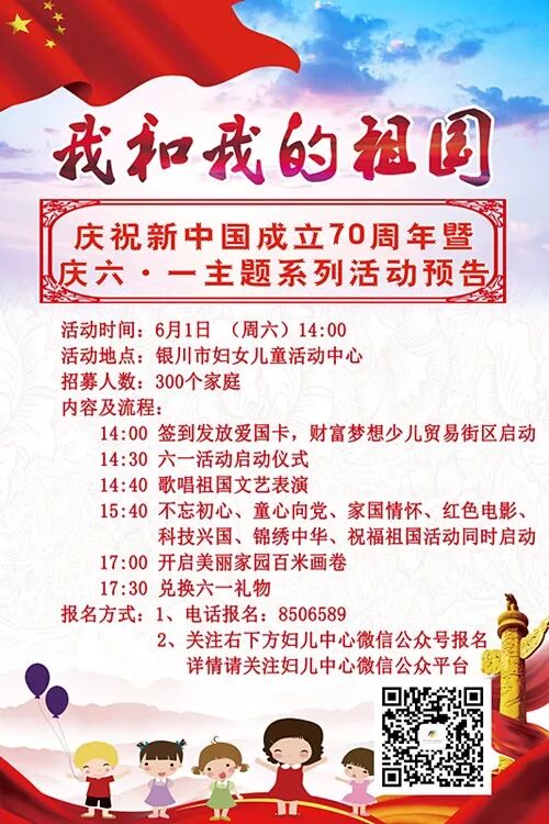 6月1日,由银川市妇联主办、银川市妇女儿童活动中心、大喇叭亲子承办的“我和我的祖国”庆祝新中国成立70周年暨庆六一大型主题系列活动,将有600个家庭1000余人共同参与十项活动!